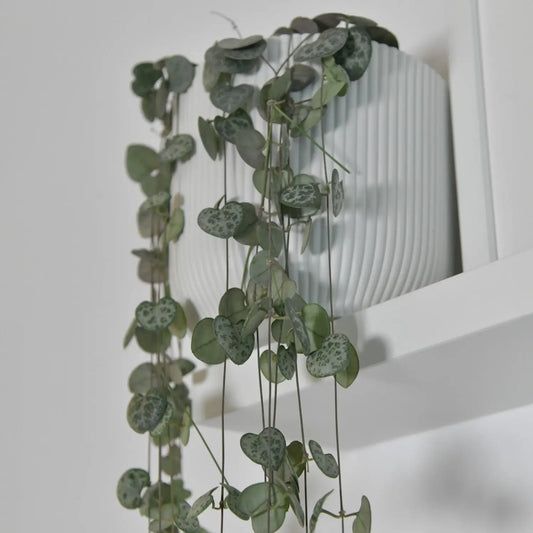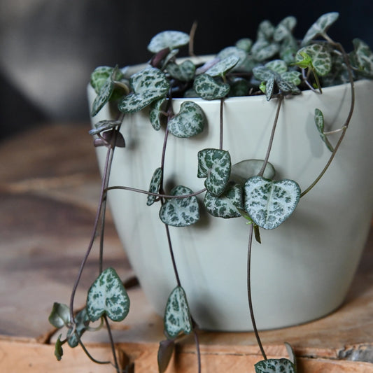 Die Leuchterblume (Ceropegia woodii), auch "String of Hearts" genannt, ist eine äußerst dekorative und pflegeleichte Zimmerpflanze. Ihre langen, herabhängenden Triebe sind mit herzförmigen Blättern besetzt, die je nach Lichtverhältnissen grün-silbrig schimmern. Ursprünglich stammt die Pflanze aus Südafrika, wo sie in felsigen Gebieten wächst. Dank ihres filigranen Wuchses eignet sie sich besonders für hängende Pflanzgefäße oder Ampeln, in denen ihre Triebe elegant herabfallen. Ihre röhrenförmigen Blüten sind meist purpurfarben und erinnern an kleine Laternen, was ihr den Namen "Leuchterblume" eingebracht hat. Die Pflanze ist nicht nur optisch ansprechend, sondern auch äußerst robust und genügsam, wodurch sie ideal für Pflanzenanfänger ist.