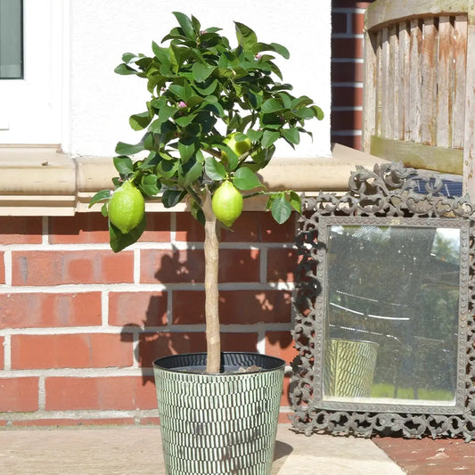 Der Zitronenbaum wächst als immergrüner Strauch oder kleiner Baum mit einer dichten, verzweigten Krone. Während junge Pflanzen eher aufrecht wachsen, breiten ältere Bäume zunehmend ihre Krone aus. Typisch sind die ledrigen, dunkelgrünen Blätter und die kleinen Dornen an den Zweigen. Unter guten Bedingungen kann er bis zu fünf Meter hoch werden, bleibt im Kübel jedoch deutlich kompakter. Seine leuchtend gelben Früchte erscheinen das ganze Jahr über und setzen einen schönen Kontrast zum dichten Laub.
