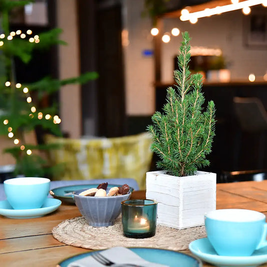 Die Mini Tannen sind ca. 20cm groß und perfekt für die winterliche Tischdeko für Drinnen und Draußen geeignet. Lasse sie dir gleich mit dem passenden Übertopf liefern.