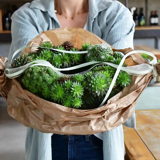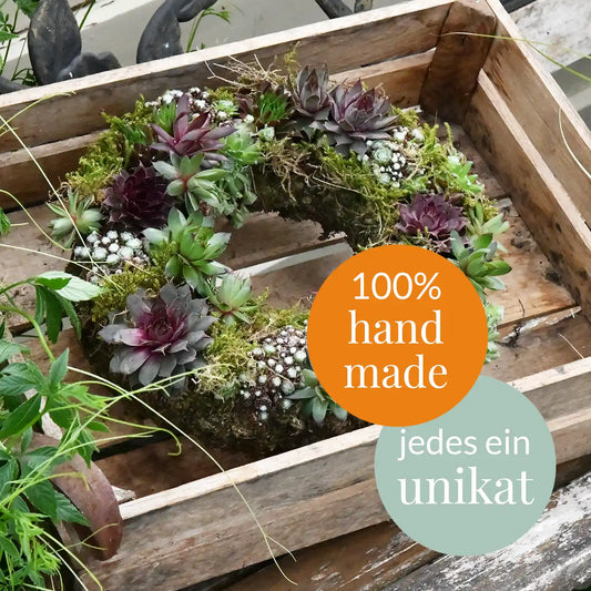 Die Mooskränze bewachsen mit Sempervivum sind eine hochwertige und individuelle Tischdekoration für Draussen. Schmücke deine Terrasse mit diesem exklusiven, winterharten und tierfreundlichen Dekohighlight.