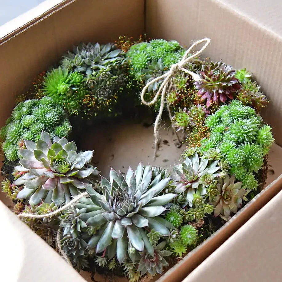 Die verwendeten Pflanzen – winterharte Sempervivum-Arten – gelten als besonders widerstandsfähig und benötigen kaum Wasser. Innerhalb weniger Monate verwurzeln sie sich vollständig im Kranz. So entsteht ein dauerhaft begrüntes, lebendiges Gesteck, das auch Jahre nach der Beisetzung ein Zeichen der Erinnerung bleibt.