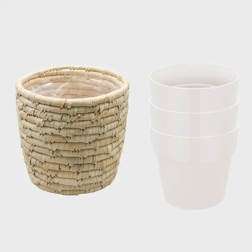 Dieses trendige Übertopf-Set passt perfekt zur 4er Pflanzenbox mit frischen Pflanzen. Die Töpfe sind eine Mischung aus Palmblatt und modern gestaltetem Kunststoff. Dieser ist aus recycelten Materialien und wird nachhaltig mit Windenergie hergestellt. Einfach mitbestellen und deine neuen Pflanzen kinderleicht in deiner Wohnung dekorieren. Erhältlich in verschiedenen Farben.
