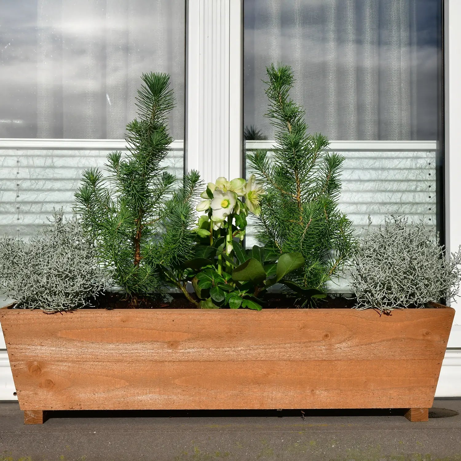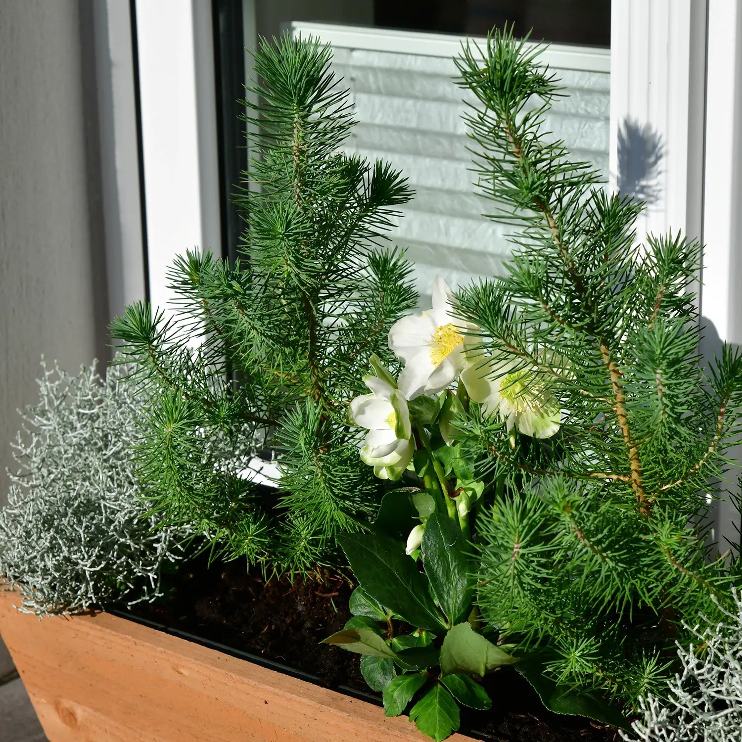 Die 5 winterharten Balkonpflanzen haben wir als Pflanzkombination für einen 60-80cm Balkonkasten zusammengestellt. Die trendigen Kiefern in Kombination mit einer Christrose und silber Stacheldraht sind einfach schön. Bestelle dir gleich Balkonkasten und Erde dazu und die Bepflanzung wird zum Kinderspiel.