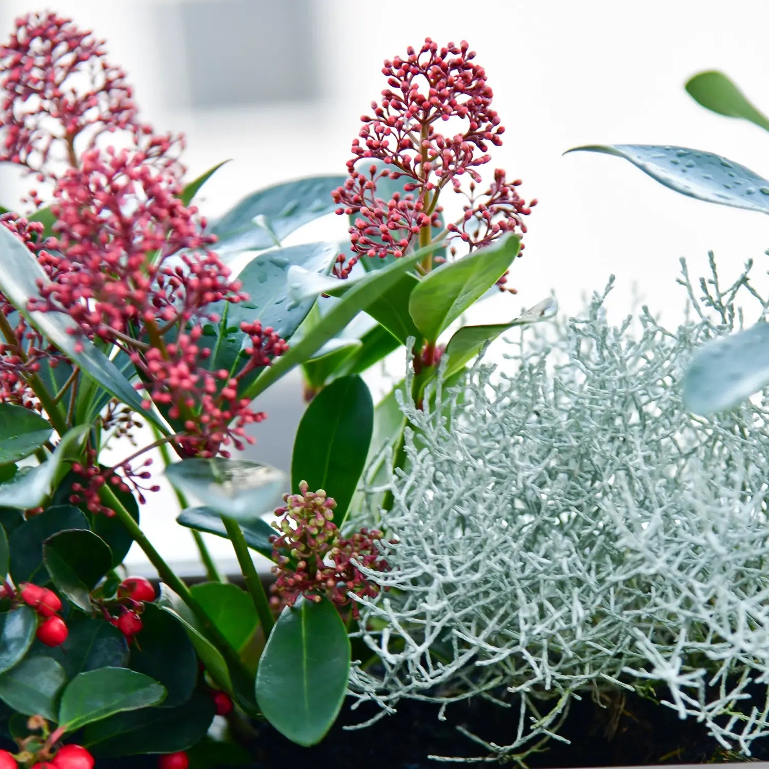 Die 5 winterharten Balkonpflanzen haben wir als Pflanzkombination für einen 60-80cm Balkonkasten zusammengestellt. Die Skimmia ist das Highlight in der Kombi. Bestelle dir gleich Balkonkasten und Erde dazu und die Bepflanzung wird zum Kinderspiel.