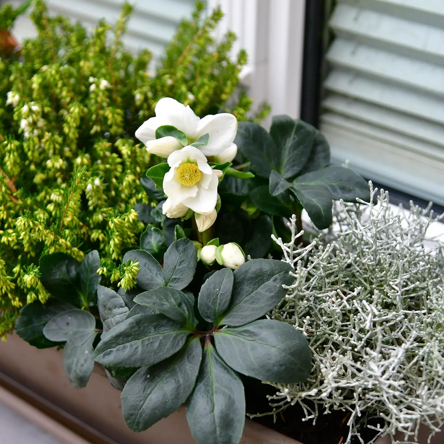 Die 5 winterharten Balkonpflanzen haben wir als Pflanzkombination für einen 60-80cm Balkonkasten zusammengestellt. Die Helleborus alias Christrosen sind das Highlight in der Kombi. Sie blühen wunderschön bis ins Frühjahr. Bestelle dir gleich Balkonkasten und Erde dazu und die Bepflanzung wird zum Kinderspiel.
