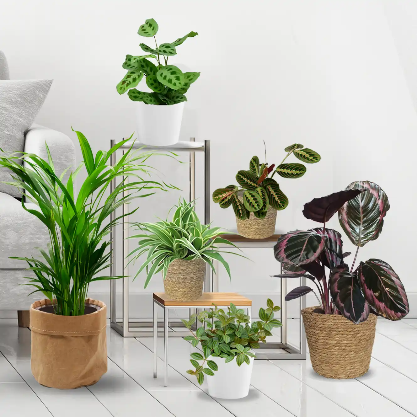Die Pinke Calathea Crimson, die gemusterte Maranta Fascinator und die dunkle Pilea Norfolk sind die Highligst im Paket Die Dypsis Plame, die rosa Callisia und der gemusterte Zwergfeffer runden das Paket ab.
