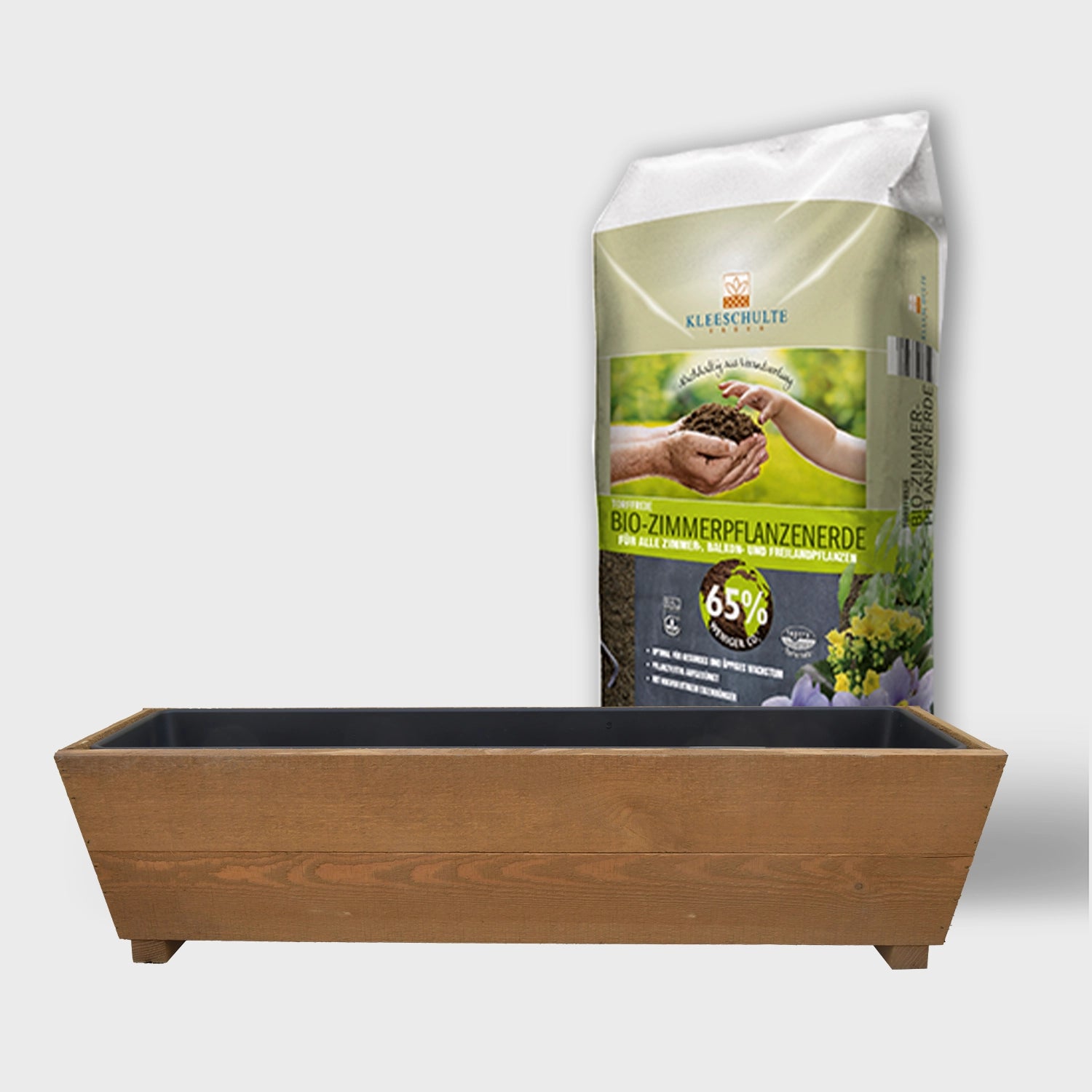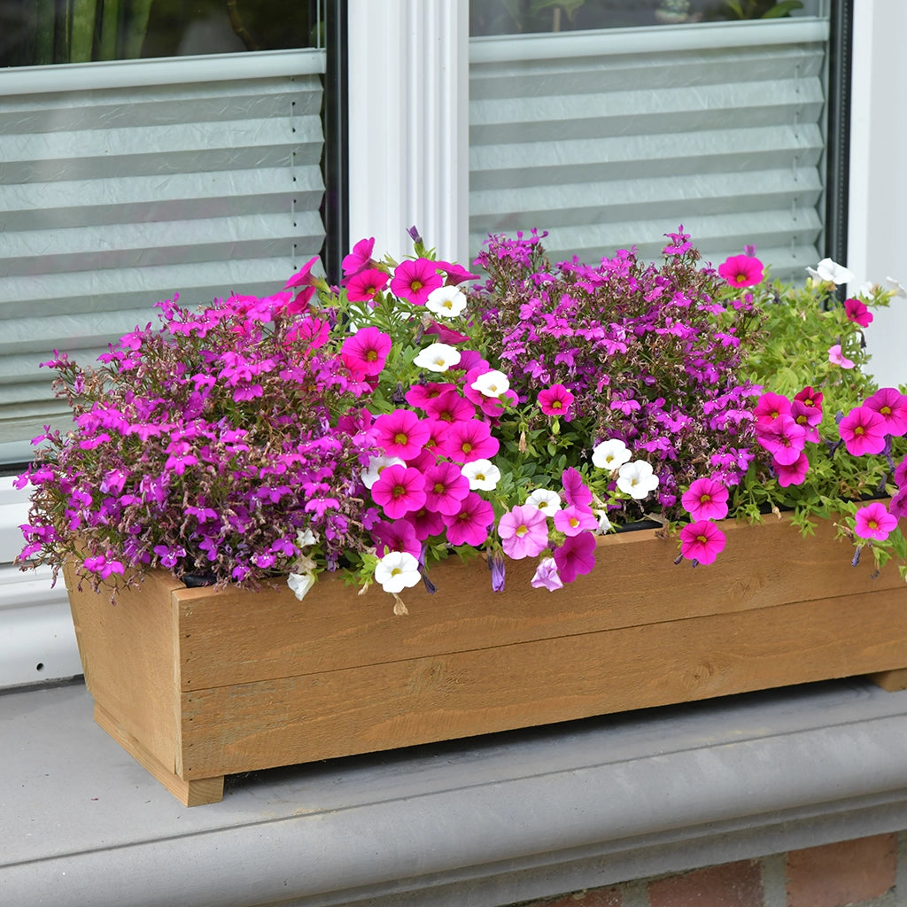 In dem Balkonkaste aus Holz steht ein Balkonkasten aus recyceltem Kunststoff, in den du deine Pflanzenpracht ganz normal wie gewohnt einpflanzen kannst. Es ist es ratsam, dass du vor dem Bepflanzen Löcher in den Boden herein bohrst, damit überschüssiges Wasser auf dem Balkonkasten herauslaufen kann. Bereits vorgezeichnete Löcher machen dir diesen Vorgang besonders einfach. Diesen bepflanzen Balkokasten stellst du dann in den Holzkasten, sodass die Bepflanzung direkt doppelt so schön aussieht.