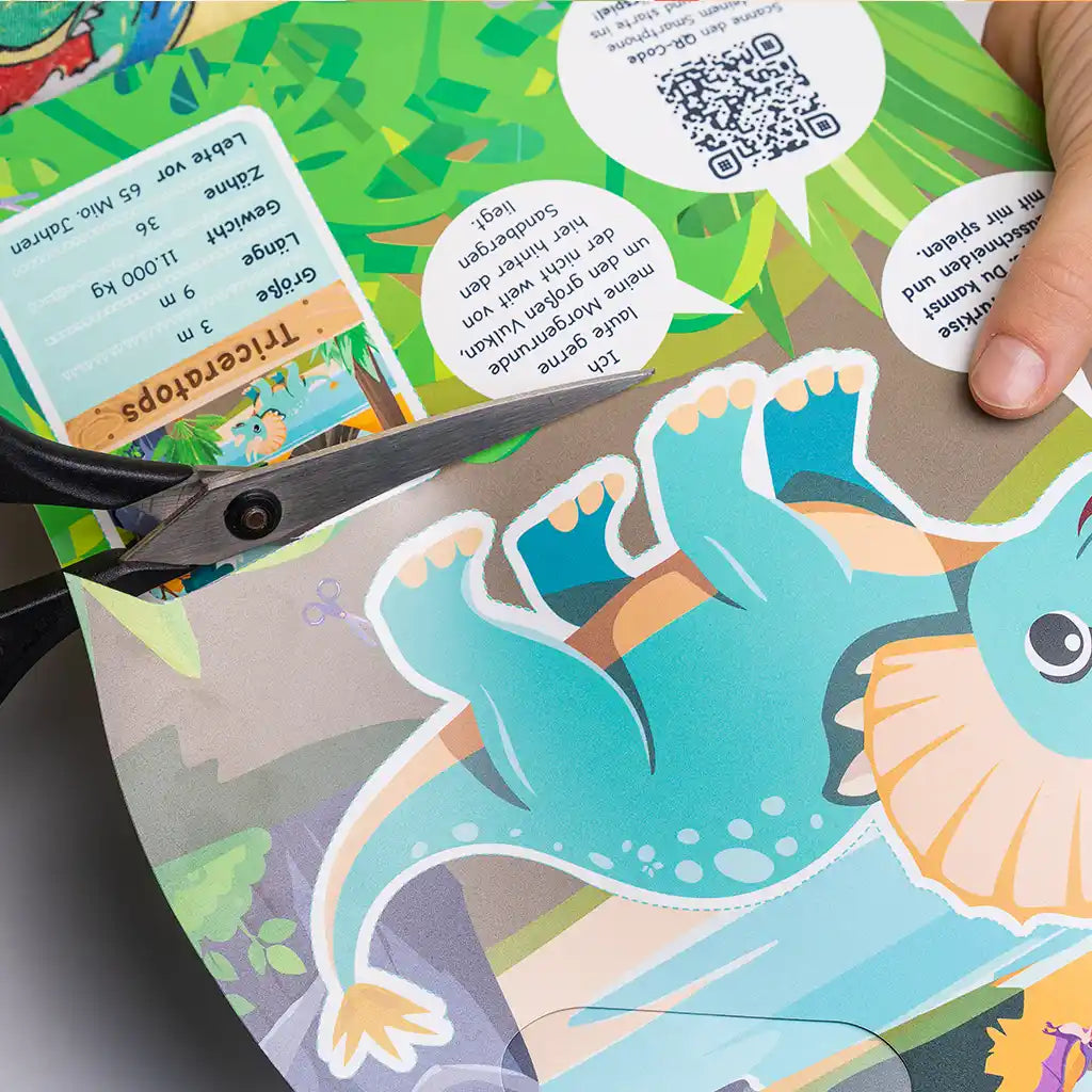 Schneide deinen Dino und den Vulkan aus und lass deiner Fantasie freien Lauf beim Basteln und Spielen. Dazu bekommst du eine Dino-Sammelkarte mit spannenden Infos zu „deinem“ Dinosaurier – perfekt zum Sammeln, Lernen und Entdecken.