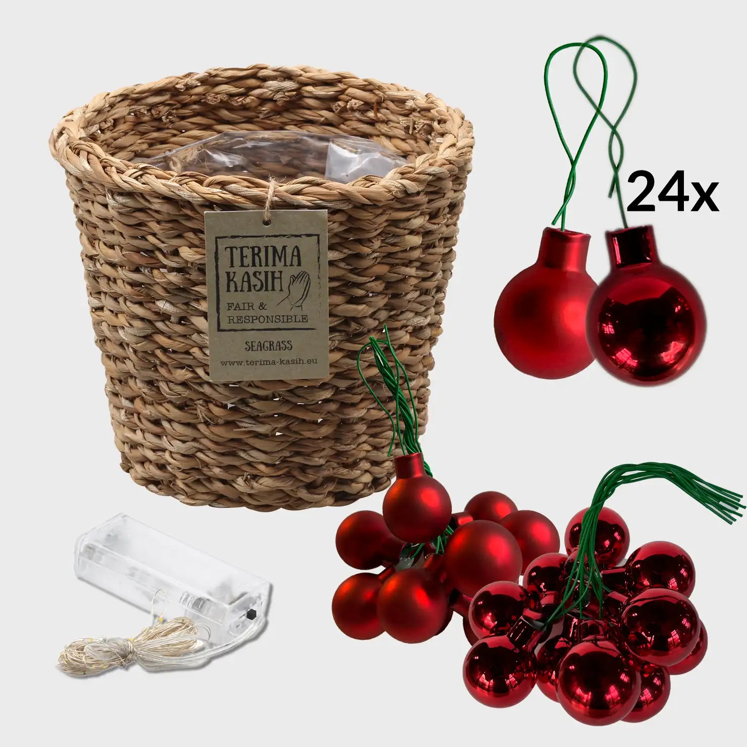 Hier bekommst du zu deinem Großen Weihnachtsbaum von über 1m gleich das passende Dekoset dazu. Der hochwertige rote Metalleimer zusammen mit den roten Kugeln und der Lichterkette sind ein tolles Komplettpaket, das den Baum richtig zum Strahlen bringt.