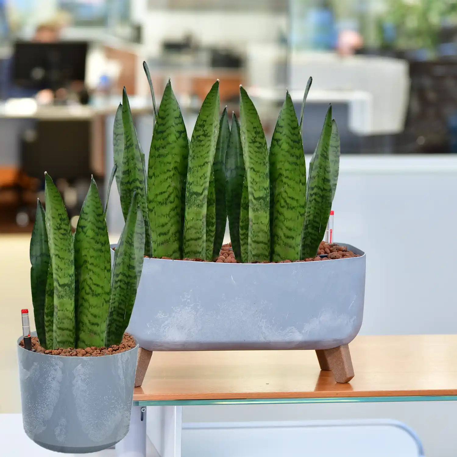 Die Sansevieria zeylanica ist eine extrem pflegeleichte und trendige Pflanzendeko für die Empfangstheke oder eine Anrichte in deinem Business. Sie kann mit praller Sonne und mit wenig Licht auskommen. Das längliche Pflanzgefäß auf Füßen für 2 Pflanzen in Hydrokultur plus 1 einzelner Topf für den Schreibtisch, sind eine moderne Lösung und mit Gießanzeiger ganz einfach in der Pflege.