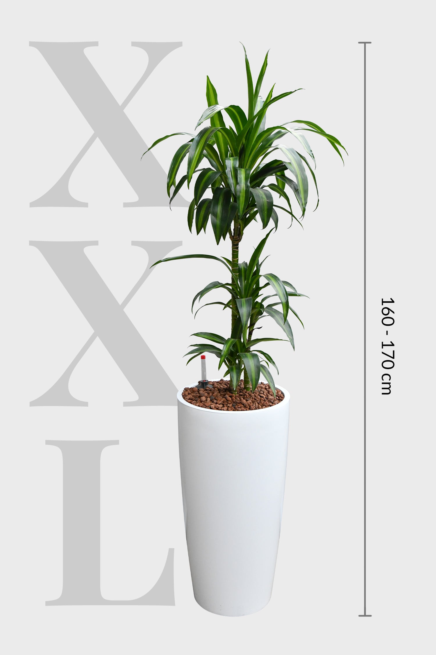 Mit dieser Kombination aus einer großen Dracaena Palme Rikki in Hydrokultur und dem hohen Pflanzgefäß, kannst du in deinem Büro eine langlebige und professionelle Begrünung zaubern. Der pflegeleichte Drachenbaum bringt schnell frisches Raumklima in deine Arbeitsumgebung und ist dazu luftreinigend.