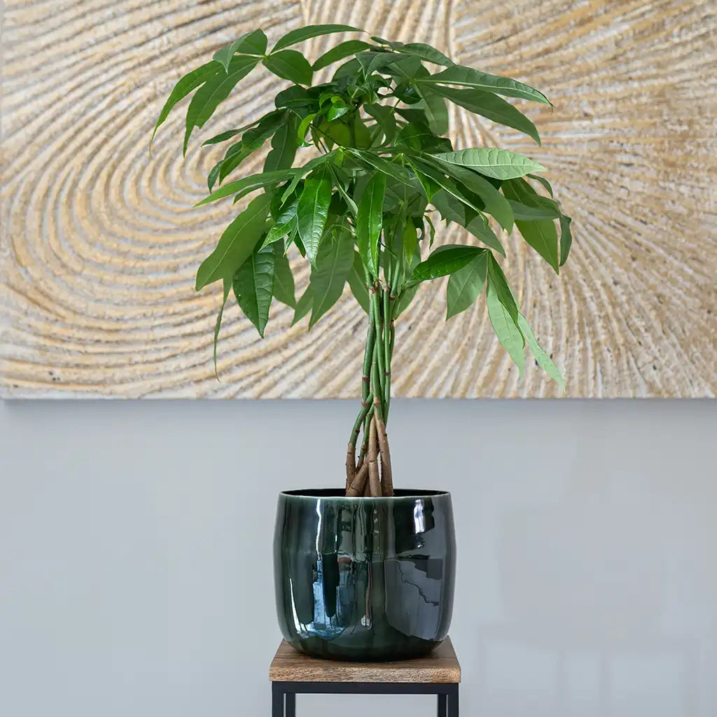 Diese große Palme macht einfach Glücklich, weil sie unkompliziert ist, schnell wächst und mit ihren gefingerten Blättern und dem geflochtene Stamm sehr besonders ist. Deine Wohnung wird mit diesem Baum zu einem Wohlfühlort für dich und deine Katze, denn die Pachira ist ungiftig und wird auch nicht so schnell angeknabbert.