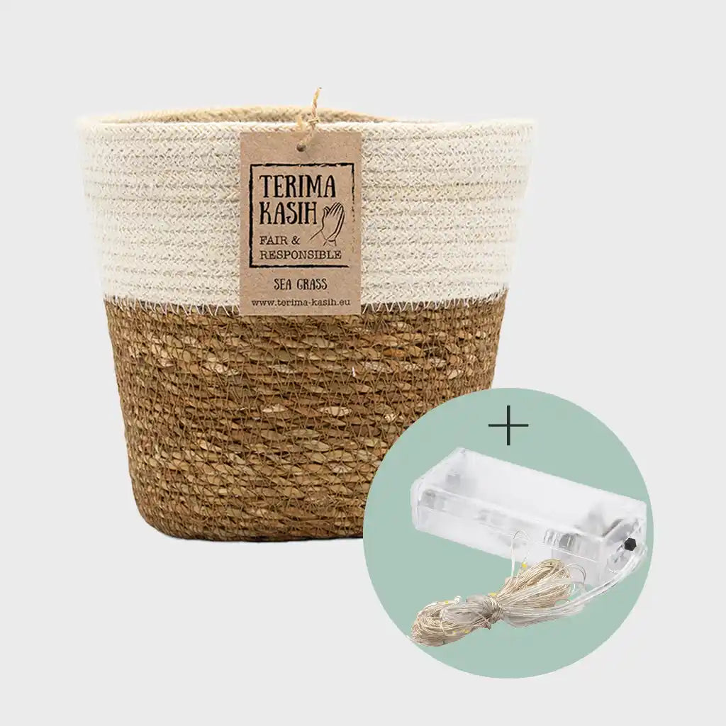 Seegraskorb Natur mit Weißem Rand 21cm mit Lichterkette 40LED