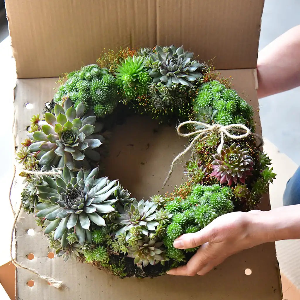 Gärtner Stephan Gärtnerei Baumeister mit lebenden Kränzen aus Tormoos und Sukkulenten